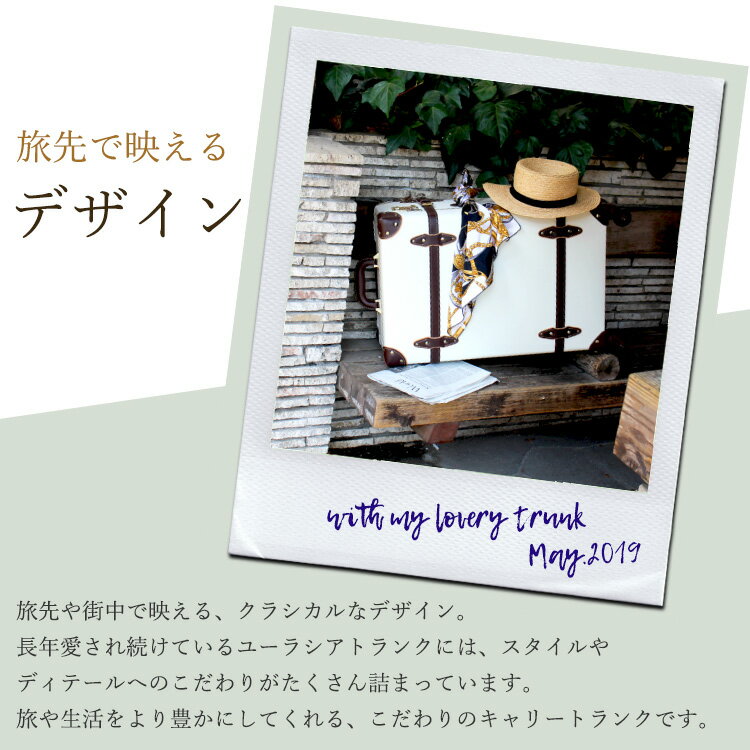 ▼メーカー希望小売価格はメーカーカタログに基づいて掲載しています▼ カタログ表紙 カタログ ■内寸サイズ 約H60×W40×D24cm ■総外寸サイズ(キャスター・取っ手含む) 約H70×W43×D25cm ■重量 約4.0kg ■容量 約52リッター ■旅行の目安 約3泊〜5泊向き ■キャリーバー 3段階調節可能 ■キャスター 4輪キャスター ■ロック 3桁のダイヤルロック(TSA無し) ■素材 合成皮革 / アルミニウムポリプロピレン ■付属品 専用収納袋 ■メーカー siffler(株式会社シフレ) ユーラシアトランク®は株式会社シフレの登録商標です。